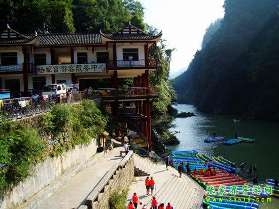 天下第一漂,起點(diǎn)哈妮宮距王村約40公里,行車1小時,終點(diǎn)牛路河距王村30分鐘的車程,漂流水路長17公里,漂流兩個半小時。從哈妮宮放舟而下,一路是古老的河道,絕壁百里,怪石嶙峋,灘奇水異,兩岸蒼翠的林木,云霧繚繞,飛瀑流泉與溶巖峰林交相輝映。拐一百五十五個彎,在一百三十三個灘潭中穿梭而行,迂回流連,馳魂奔魄,心曠神怡。
