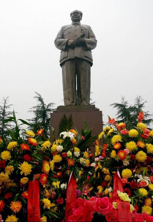 毛澤東銅像位于韶山沖的中心,紀(jì)念館、毛氏宗祠與韶山賓館之間。銅像區(qū)占地5200平方米,是經(jīng)中共中央批準(zhǔn)興建紀(jì)念毛澤東同志誕辰100周年的重點(diǎn)獻(xiàn)禮工程。這里原是一片沃野,地勢平坦開闊,周圍群山拱護(hù)。韶蜂在遠(yuǎn)處,高峻挺拔,云富坨大山巍峨雄壯,十八羅漢山逶迤綿長,黑石寨鐵骨錚錚。在山的襯托下,銅像更顯得氣勢磅礴。
