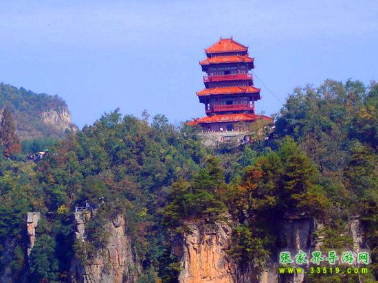 這是六層四重檐穿頭式仿古建筑,高30米,由深圳市政府捐建。建立之初,本打算取名叫“深圳閣”,但遭到許多人(包括深圳人)反對(duì),認(rèn)為這樣與整個(gè)天子山的風(fēng)景不是很協(xié)調(diào)。不過從另一個(gè)角度來看,深圳人這種“經(jīng)營(yíng)城市”的意識(shí),卻非常值得張家界人學(xué)習(xí)。“欲窮千里目,更上一層樓”,登樓遠(yuǎn)望,天子山群峰盡收眼底,別有一番風(fēng)景。