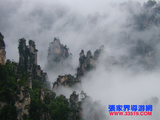 天子山還有云霧、月夜、霞日、冬雪四大奇觀。云霧,是天子山最多見的天象奇觀。有云霧、云海、云濤、云瀑和云彩等景象。久雨初晴之后或霏霏 細(xì)雨之中,先是朦朧大霧,繼而形成白云,環(huán)繞飄浮。群峰在無邊無際的云海中時(shí)隱時(shí)現(xiàn),使人仿佛置身于蓬萊仙境之中。有時(shí)云霧從溪口涌出,爬過峰頂, 然后以鋪天蓋地之勢(shì),飛瀉而下,形成云瀑,十分壯觀。月夜,當(dāng)月明星稀,萬籟俱寂時(shí),這里的峰林被朦朧月色披上了一層“魔紗”,似一群群魔影聳立在幽谷之中。耳聞禽獸嚦嚦的叫聲,使人產(chǎn)生一種神秘感。霞日,晴天的早晨,一輪紅日在朵朵紅云的襯托下,從奇山異峰中冉冉升起。千萬座石塔,婷婷玉立,披上一層紅霞,十分迷人。 冬雪,入冬,天子山銀裝素裹,青松和峰頂被大雪復(fù)蓋。此時(shí)的天子山冰柱倒立,冰花四散,只有一些山鹿 、野豬,才不為銀白世界所征服。