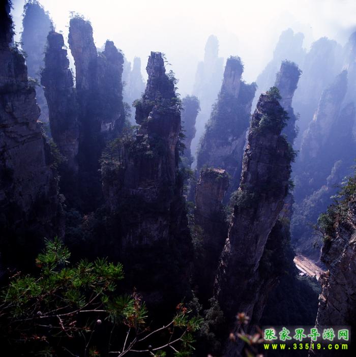 眼前這幾支細(xì)細(xì)瘦瘦的山峰,好像一支一支、一節(jié)一節(jié)地從這個(gè)峽谷中長(zhǎng)出來的一樣,形狀很像一排倒插在筆筒中的毛筆。筆尖、筆桿可以分得清清楚楚,尤其是頂部一些不大不小的松樹,剛好像是毛筆的筆毫!這簡(jiǎn)直就是出自能工巧匠之手!山長(zhǎng)成這樣子多么不容易啊,它經(jīng)過億萬年流水切割、風(fēng)雨侵蝕、重力崩塌等多種復(fù)雜的地質(zhì)作用才最終形成。除了大自然,誰有這樣的匠心和耐心,對(duì)堅(jiān)硬如鐵的石英紗巖進(jìn)行這樣的精雕細(xì)刻?有人說,張家界如詩如畫的風(fēng)景,就是這幾支筆以青山綠水為線條,以風(fēng)花雪月為色彩,以時(shí)間空間為畫紙畫出來的。