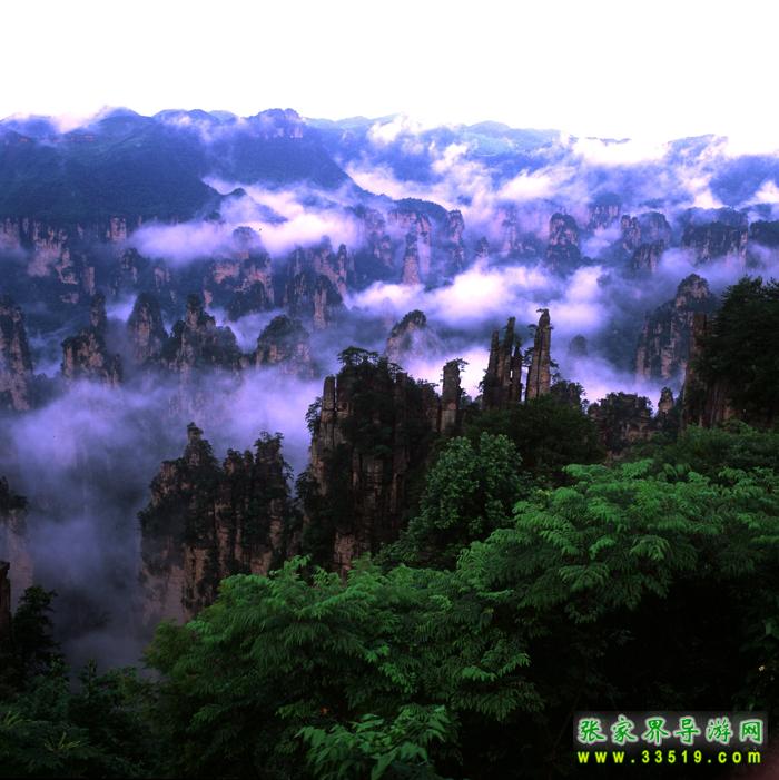 武陵源獨特的石英砂巖峰林在均屬國內(nèi)外罕見,在360多平方公里的面積中,目前所知有山峰3000多座,這些突兀的巖壁峰石,連綿萬頃,層巒疊嶂。每當雨過轉晴或陰雨連綿天氣,幽幽山谷中生出了云煙,云霧飄緲在層巒疊嶂間,云海時濃時淡,石峰時隱時現(xiàn),景象變幻萬千。霧,使晴日下堅硬的山峰變得妖嬈、飄逸和神秘。觀霧的最好季節(jié)是夏季,天子山是賞霧的最佳去處,也是攝影家常常涉足的地方。