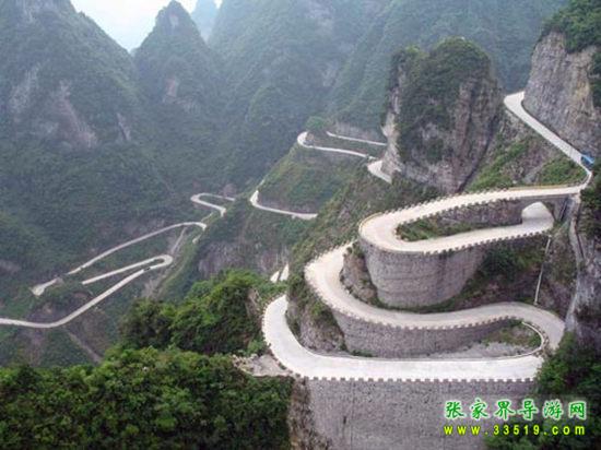 極具險絕奇觀的天門山盤山公路——“通天大道”則是天門山的另一壯景。通天大道態(tài)勢險絕,蕩氣回腸,更以蜿蜒迂回穿行于山體絕壁之天險而“堪稱天下第一公路奇觀”。它全長10.77公里 ,從標(biāo)志門直達天門洞腳下,海拔從200米急劇提升至1300米,共有九十九個彎,大道兩側(cè)絕壁千仞,空谷幽深,180度的急彎此消而彼長,層層疊起,中國書法協(xié)會常務(wù)副會長 沈鵬 先生走過通天大道后欣然為其題字“曲道通天”,字體遒勁挺拔,與通天大道的奇絕天下相融為一體。