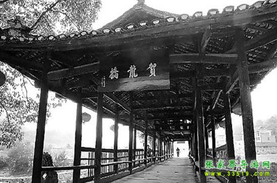 賀龍橋原稱“永安橋”。飛架于賀龍故居右側玉泉河上,是一座石墩、木粱、騎廊的風花橋。東西長40米、寬7米、高8米。龍爪翹檐,中聳堡亭,8尊石獅,分置橋頭及石墩之上,造型渾厚古樸,富有民族特色。此橋原是溝通桑植內外半縣的必經之道,是上川鄂下津澧的要津,也是當年鹽局奪槍、桑植起義的發(fā)端處。系賀龍曾祖父賀廷宰首倡捐資修建,幾番修而復圮。至1916年,終由賀龍父親賀仕道襄修告竣。1929年冬,桑植“剿共”司令陳策勛,謂以破“賀氏風水”,令毀此橋。解放后,桑植縣人民政府于1952年冬按原樣復修,命名“賀龍橋”。“文化大革命”動亂中,林彪、“四人幫”誣陷賀龍,指使“紅衛(wèi)兵”毀橋,群眾奮起護衛(wèi),才幸免劫難。1983年5月,賀帥女兒賀曉明應縣政府請求,得全國書法家協會秘書長謝德萍書匾“賀龍橋”,高懸橋之東西首,永志紀念。1978年,賀龍故居及其生平業(yè)績陳列室、賀龍橋,列為省級重點文物保護單位。凡到賀龍故居、賀龍紀念館的游客這是必經之地。