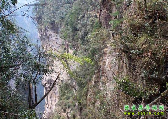 由群仙開(kāi)宴景點(diǎn)沿石徑蜿蜒而下約200米處,一巨峰于半腰分裂,內(nèi)可行人,長(zhǎng)300米,寬0.1-1米。南側(cè)懸崖峭壁,深不見(jiàn)底。北側(cè)石壁高50米,抬頭不見(jiàn)其頂。人行其內(nèi),如置身空中長(zhǎng)廊。廊中虬松懸崖,亂云飛渡,山風(fēng)呼嘯。廊之東、南和西南三面峰立如林,或如城墻,或加堡壘,各呈奇舉。