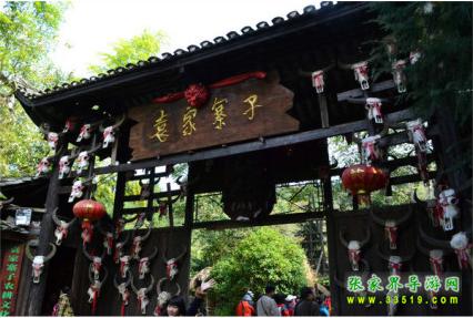 土家族建筑的特色,寨門檐角向上翹起,中間橫著“