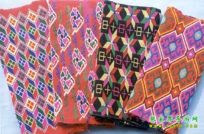 織錦。又名“西蘭卡普”、“土花鋪蓋”,為土家族傳統(tǒng)工藝品之一,是森林公園工藝品廠的主要產(chǎn)品。織錦是在特制的本質(zhì)織機(jī)上以錦紗為經(jīng)、五彩絲線為緯、手工提花織成。以其質(zhì)地厚實(shí)、堅(jiān)韌,色彩鮮艷,格調(diào)古樸,流暢生動(dòng)著稱。圖案有花草、鳥獸、生產(chǎn)、生活、幾何、字樣等種類。為舊時(shí)土家姑娘必備嫁妝之一。據(jù)考證,早在漢代,土家織錦就作為方物貢入漢室宮廷。20世紀(jì)后,土家織錦曾漂洋過海至日、美、英等國(guó)展出,并作為禮品,被國(guó)家領(lǐng)導(dǎo)人贈(zèng)送給外國(guó)元首及政府官員,如今織錦以壁掛、枕巾、沙發(fā)墊、桌圍、提袋、服飾等多種式樣遠(yuǎn)銷世界各地。