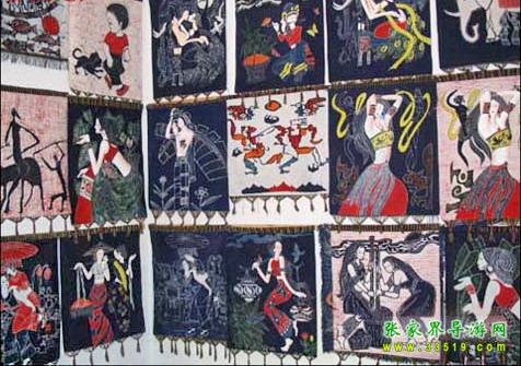 刺繡。是土家姑娘在直紋平布上,按照布紋的經(jīng)緯和預(yù)先繪畫的花樣與底色不同的絲線繡成圖案。舊時(shí)姑娘們穿的繡花衣服,繡有服飾花邊、胸花、帽花,此外繡花枕頭、繡花荷包等也是精巧的手工工藝品。土家刺繡在配色上有自己的講究與習(xí)慣,一般選用青、藍(lán)、大紅等深色布料作底布,用淺色繡線制作圖案,或者相反,兩種用法的結(jié)果使繡品顯得質(zhì)樸逼真,色澤鮮艷,對(duì)比強(qiáng)烈。傳統(tǒng)圖案有“花開富貴”、“龍鳳呈祥”、“鴛鴦戲水”、“喜鵲鬧梅”、“松鶴同壽”等,分室內(nèi)、衣著、工具、行李裝飾等多種種類。在景區(qū),土家婦女邊繡邊賣的精美鞋墊,深受海內(nèi)外游客喜愛。