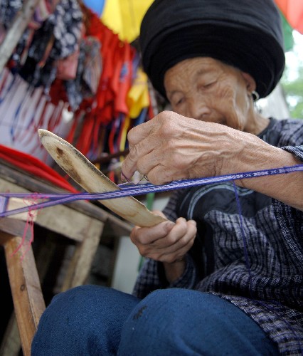 心靈手巧的苗家姑娘不僅會繡花,會紡紗織布,還能紡織各種圖案的花帶。