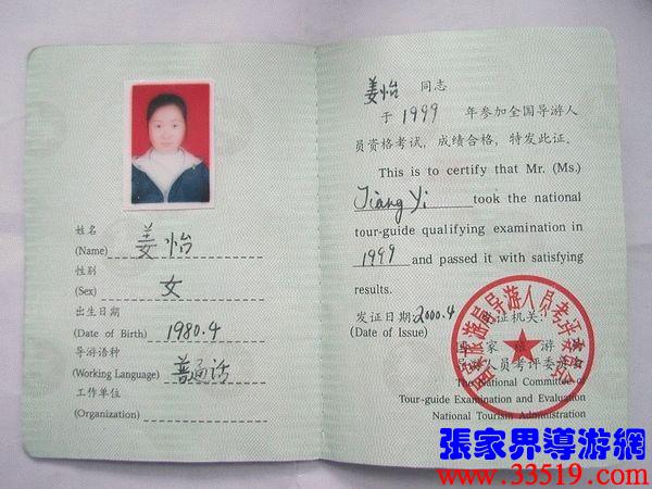 | 姜怡,女,導游員資格證書編號:Hun990125。 大專學歷,自99年9月森林保護節(jié)前開始從事導游工作,同年十二月參加全國導游員資格考試,并以優(yōu)異成績取得“國導證”,現(xiàn)為張家界華天國旅旅行社的專職導游員。整個帶團期間,無論團隊或散客,未出現(xiàn)一次旅游事故或游客投訴事件,普遍反映帶團效果好。 | 導游自述