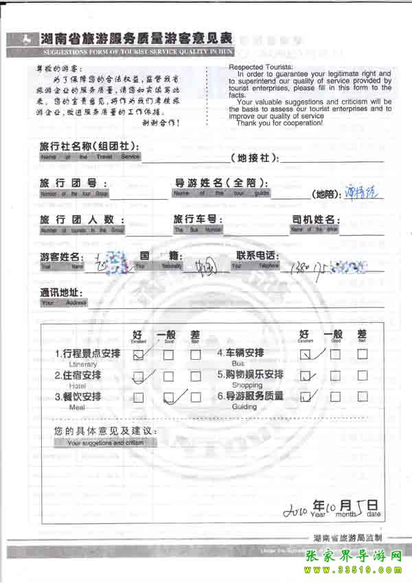 2010年10月5日趙先生旅游質(zhì)量反饋
