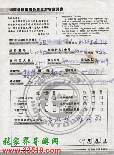 2009年10月31日新加坡黃先生一行27人旅游接待質量反饋單: